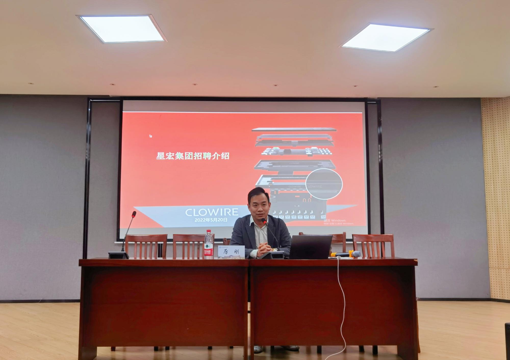 会议最后,星宏集团总经理、我校杰出校友厉刚带来企业招聘宣讲。他介绍了公司的品牌文化、发展历史、产品体系和招聘需求。宣讲后,他与部分有求职意向的同学进行了深入的沟通与交流。