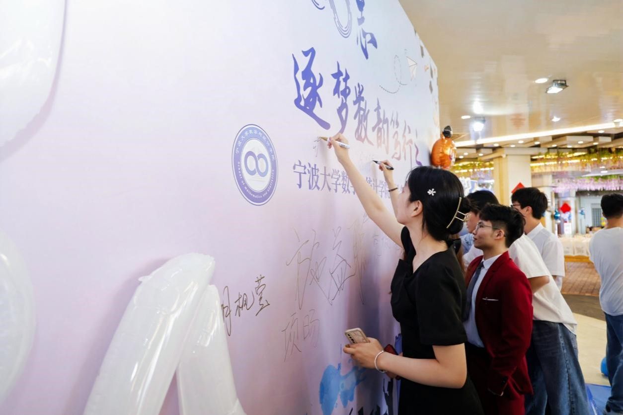 欢送会开场前,在会场入口的画布一角,毕业生同学们正用手中的笔轻轻滑动,留下了对未来的期许和对友情的珍视。画布上密布的签名和印记,宛如一小块一小块的时光碎片,共同拼凑出一幅独一无二的回忆画卷。