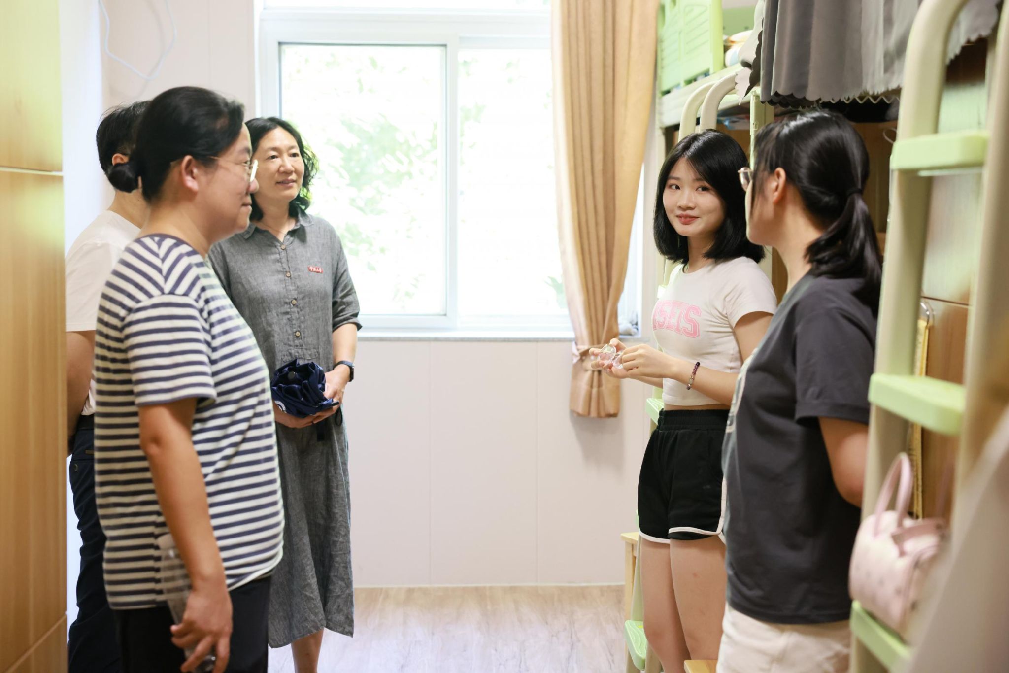 党委书记霍妍、党委副书记姜萍、副院长徐松、副院长李莉、工会主席李茂华及新生班主任、辅导员一行走进新生宿舍,与同学们“拉家常、聊近况、话学业”,送上来自麻豆社