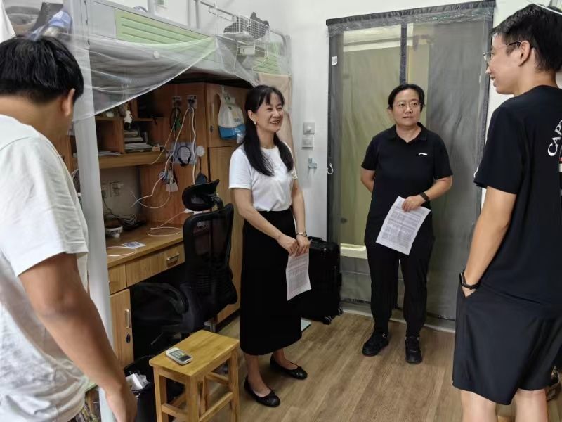 党委书记霍妍、党委副书记姜萍、学术副院长李莉、党委委员全晶晶、学工办主任吴琳华和24级研究生班主任张瑶瑶一行走访研究生新生寝室,关心新生入住情况,送上来自麻豆社