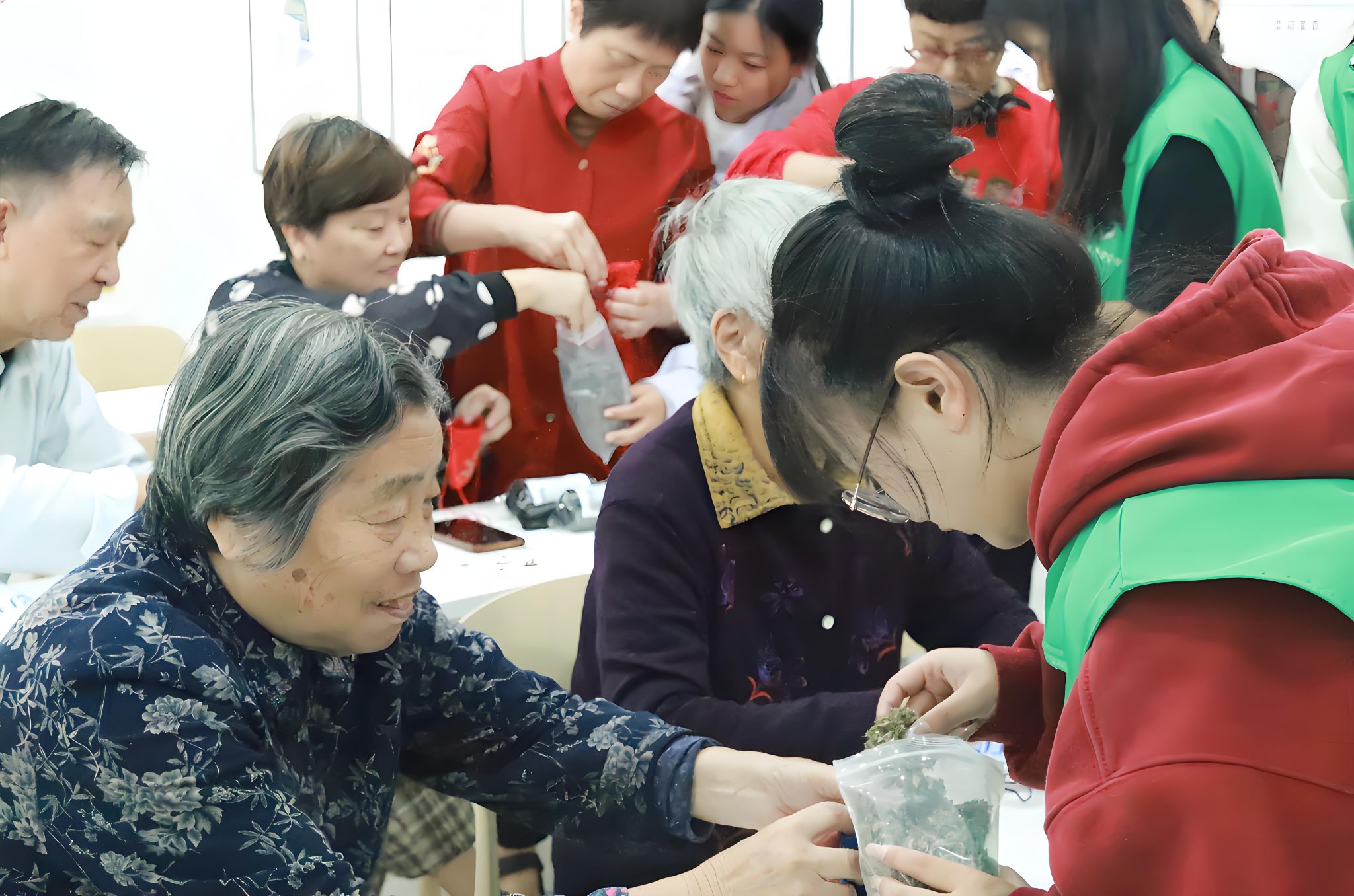 遥想屈子纫秋兰以为佩,腰间香囊轻摇,馨香弥漫全场。活动现场,志愿者们还引导大家亲手制作香囊。老人们为家人精心制作了香囊,将纯净的牵挂化作跨越时空的纽带。现场弥漫着淡淡的香气,温馨而祥和。这些香囊不仅承载着对平安健康的祈愿,也传承了尊老爱老的美德,体现了中华儿女对长辈的深深敬意和无言的爱。