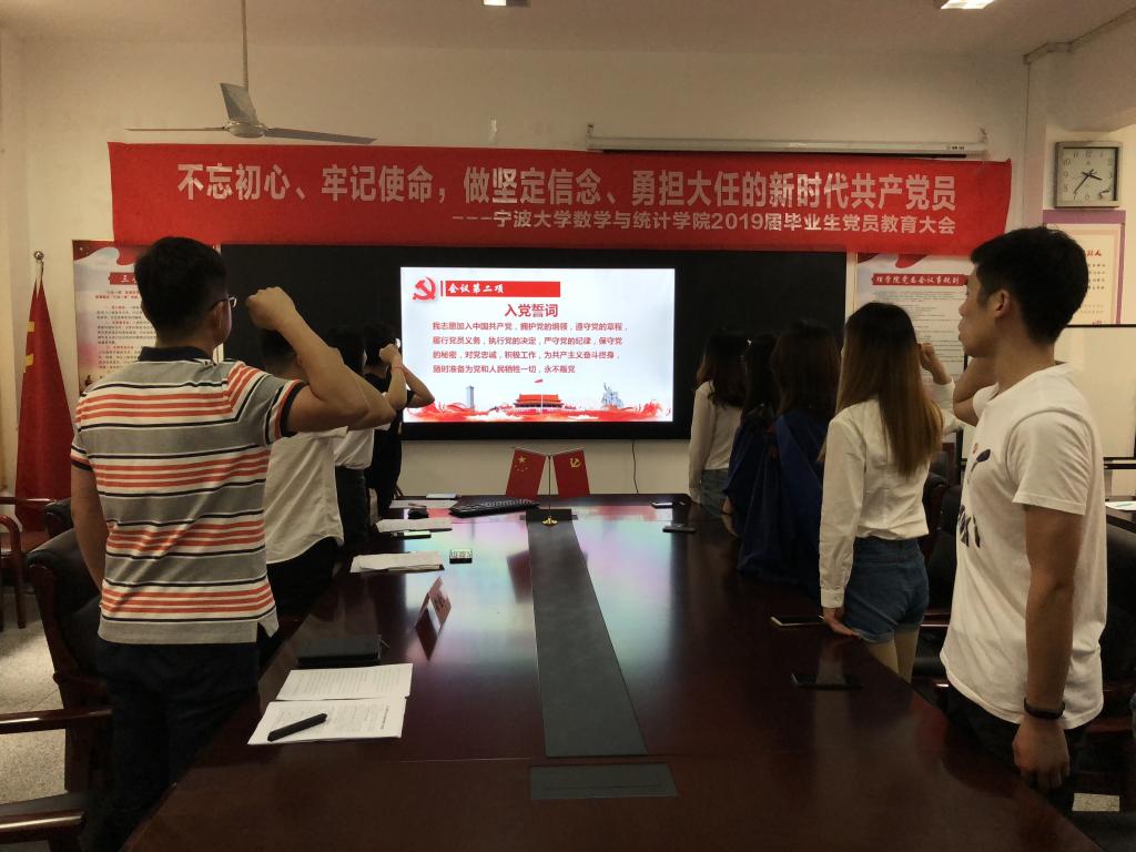 于龙赛理科楼北楼116会议室召开主题为“不忘初心、牢记使命,做坚定信念、勇担大任的新时代共产党员”的2019届毕业生党员教育会议。学院党委书记俞金波、党务秘书张宾及2019届全体毕业生党员参加了本次会议,会议由张宾主持。