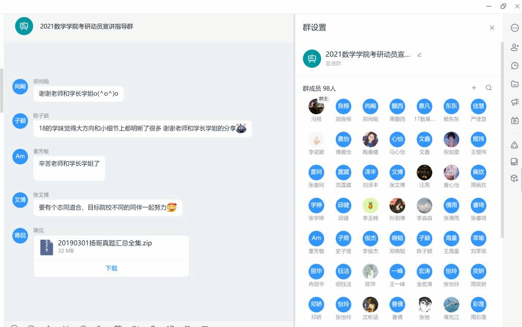 本次动员大会开始学工办冯程老师简单介绍了近三年的考研情况。接着胡良根老师开始宣讲,他有丰富的考研指导经验,曾指导2017届数学与应用数学基地班(46人)考研率突破50%。胡老师主要讲从目前考研形势、院校选择和具体备考策略为17级考研学生分享了宝贵的经验。随后,2017级班主任代表蒋侃、蒋先江、李建峰老师分别从找一个考研搭档,如何让做好规划,如何选择好国内国外两种升学方式做了考研动员宣讲。此次考研动员大会还特别邀请了17届考入中山大学的王若宁、18届考入湖南大学的申旭彤和19届考入电子科技大学的邵森三位优秀考研学长学姐“以身说法”分享了自己的考研备考经验。最后的线上交流环节2021届考研备考学子互动热烈。