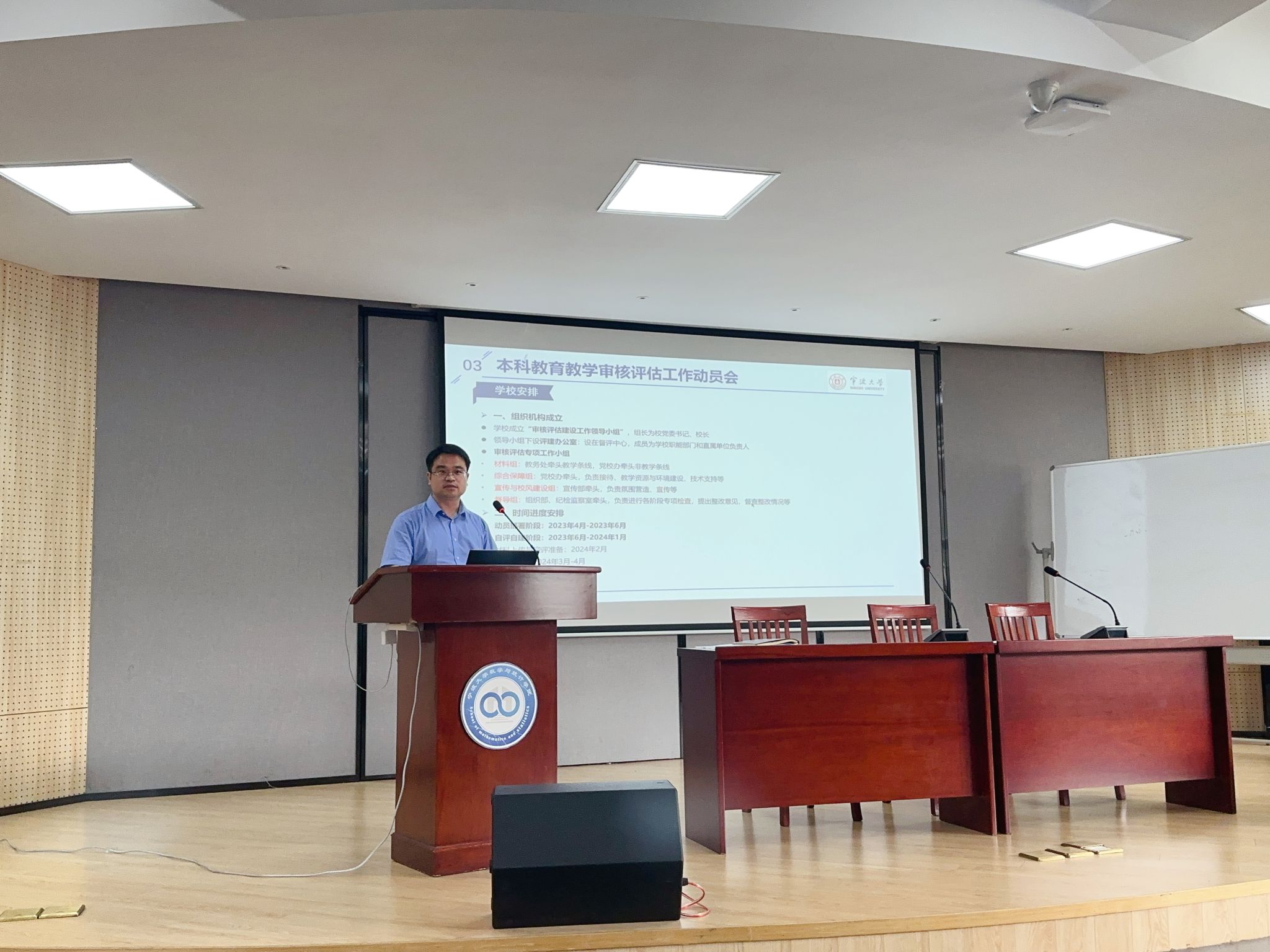 徐松老师介绍了新一轮本科教育教学审核评估的背景、重要意义及学校的相关安排和部署,明确了审核评估工作的时间节点要求,重点讲解了学院评估工作的组织机构与各阶段的具体分工,动员全院教师统一思想、坚定信心、凝心聚力,全力以赴做好新一轮审核评估工作。