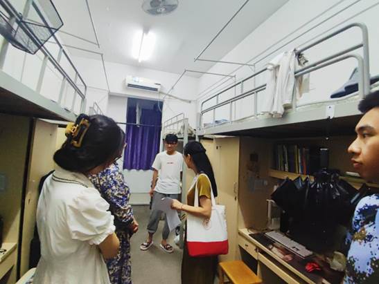 2023年7月10日晚,学院党委书记霍妍、学院党委副书记姜萍,学生辅导员老师侯婷婷一同前往2022级大类分流学生宿舍走访,实地了解分流学生近日的军训状态以及进入新学院后的学习、生活情况,为大家送去学院的关心和问候,帮助大家尽快适应新环境。
