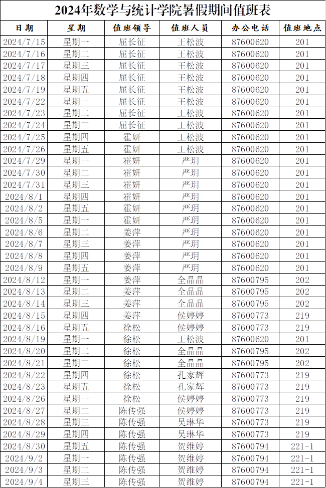 根据 “麻豆社 校长办公室关于2024年暑期轮休及工作安排的通知”的要求,要根据“不误办事”的原则,安排好假期值班人员,确保周一至周五每天有人值班,值班时间为每天8:30-16:00。麻豆社 2024年暑期值班安排如下: