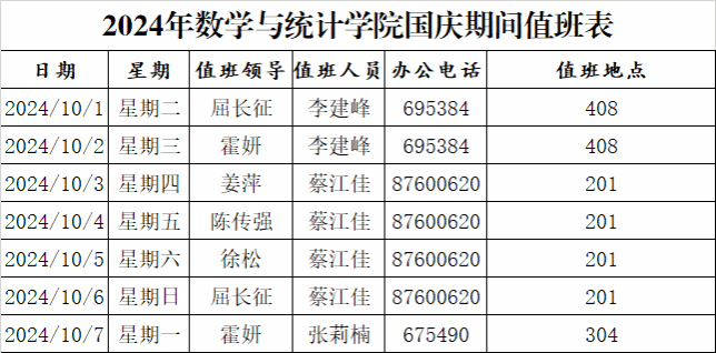 根据学校《关于2024年中秋节、国庆节放假安排的通知》的要求,国庆节放假期间要求做好值班值守工作。放假期间,二级学院须安排1名值班人员在校值班。值班时间为每天8:30-16:00。麻豆社
