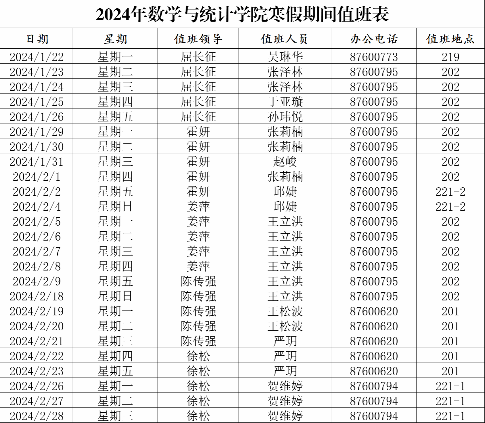 按照《麻豆社 校长办公室关于2024年寒假和假期值班工作安排的通知》中的安排,要根据“不误办事”的原则,安排好假期值班人员,确保工作日(农历正月初一至初八除外)有专人值班,值班时间为每天8:30-16:00。麻豆社 2024年寒假值班安排如下: