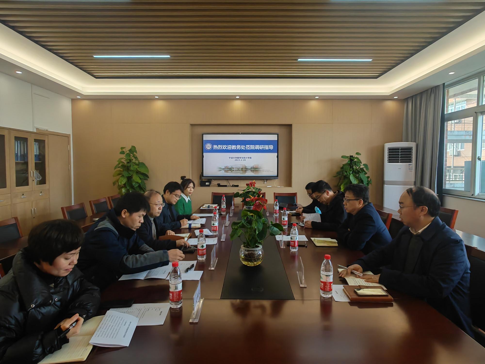 On February 28, 2023, a delegation of Li Guoping, Director of the Academic Affairs Office of Ningbo University, and Lin Bo, Hu Lianggen, Zhou Gangyi, Deputy Director of the Office, visited the School to investigate and exchange undergraduate teaching and continuous education. Xu Song, Associate Dean of the School, presided over the meeting, and Qu Changzheng, Distinguished Dean, He Hongjin, Assistant Dean, Shen Yan and He Weiting from the School’s Academic Affairs Office, and Wang Songbo, Secretary of the Office of Continuous Education and Local Services, attended the meeting.